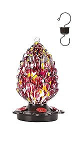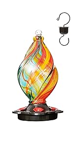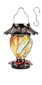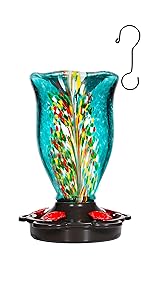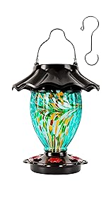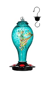 LUJII Hummingbird Feeder, Hand Blown Glass Hummingbird Feeder, Never Fade, 36 Fluid Ounces, 5 Feeding Metal Stations, Much Bigger, Garden Backyard Decorative, Containing Ant Moat (Blue)